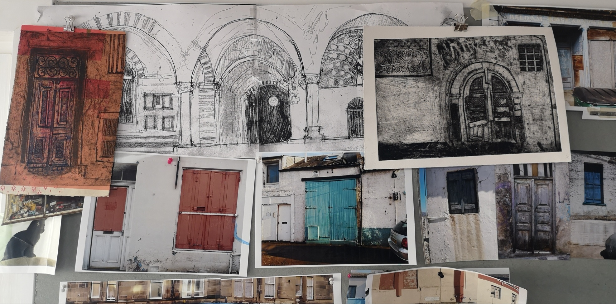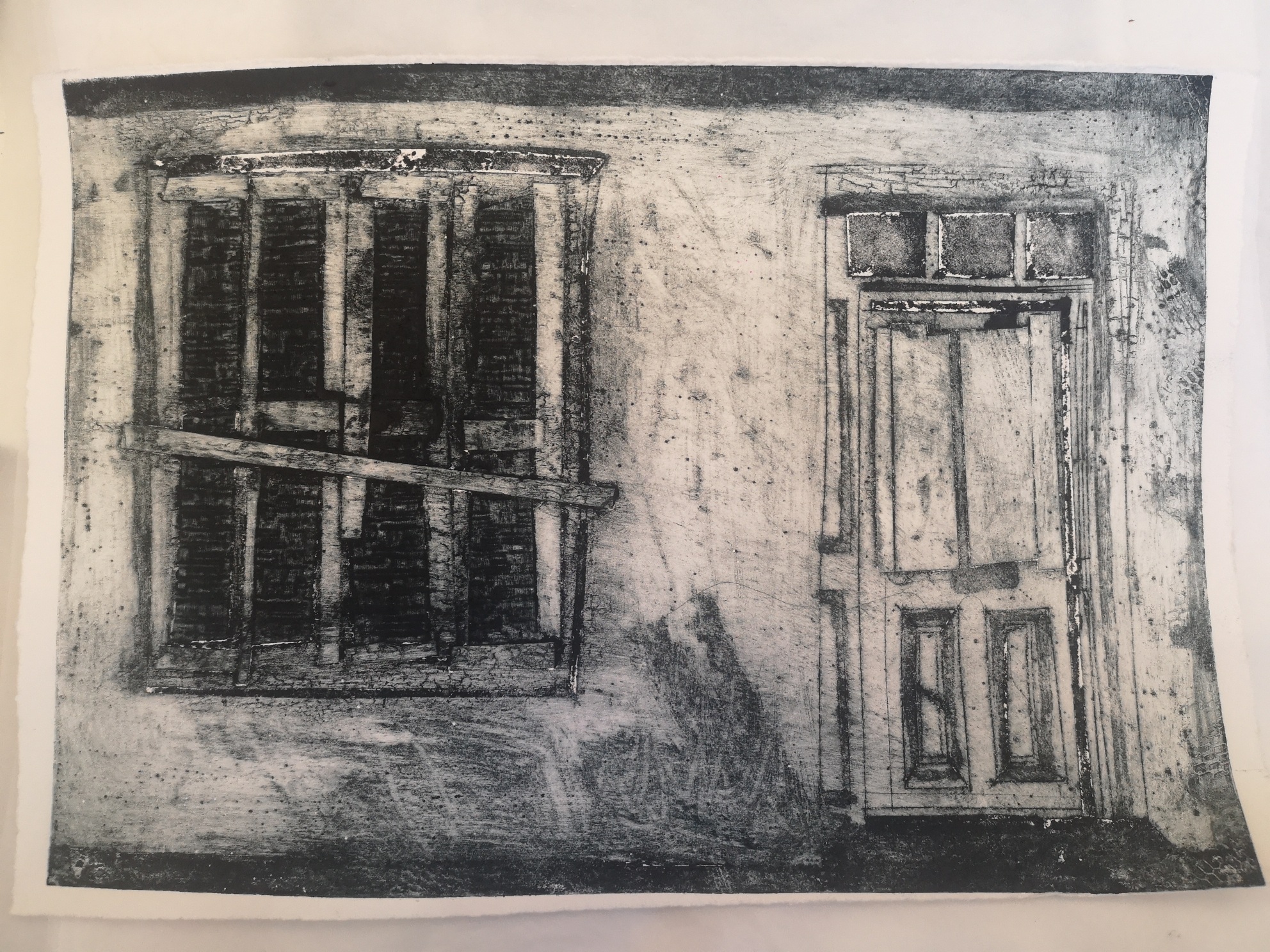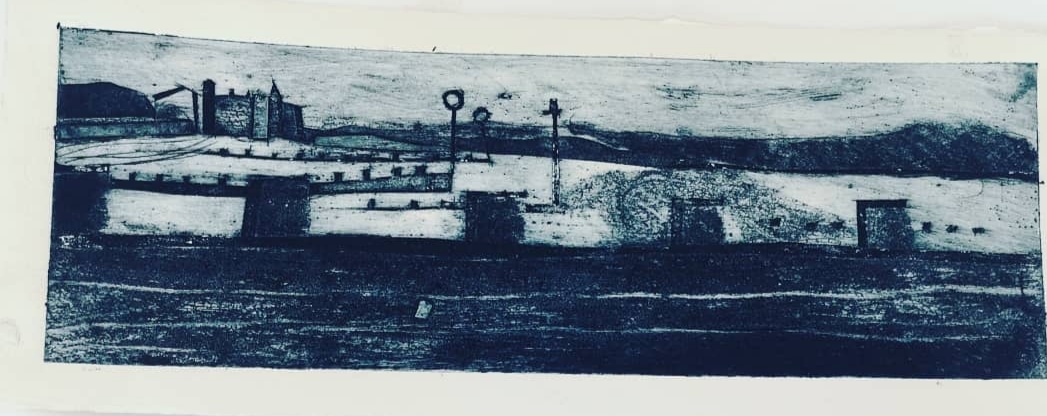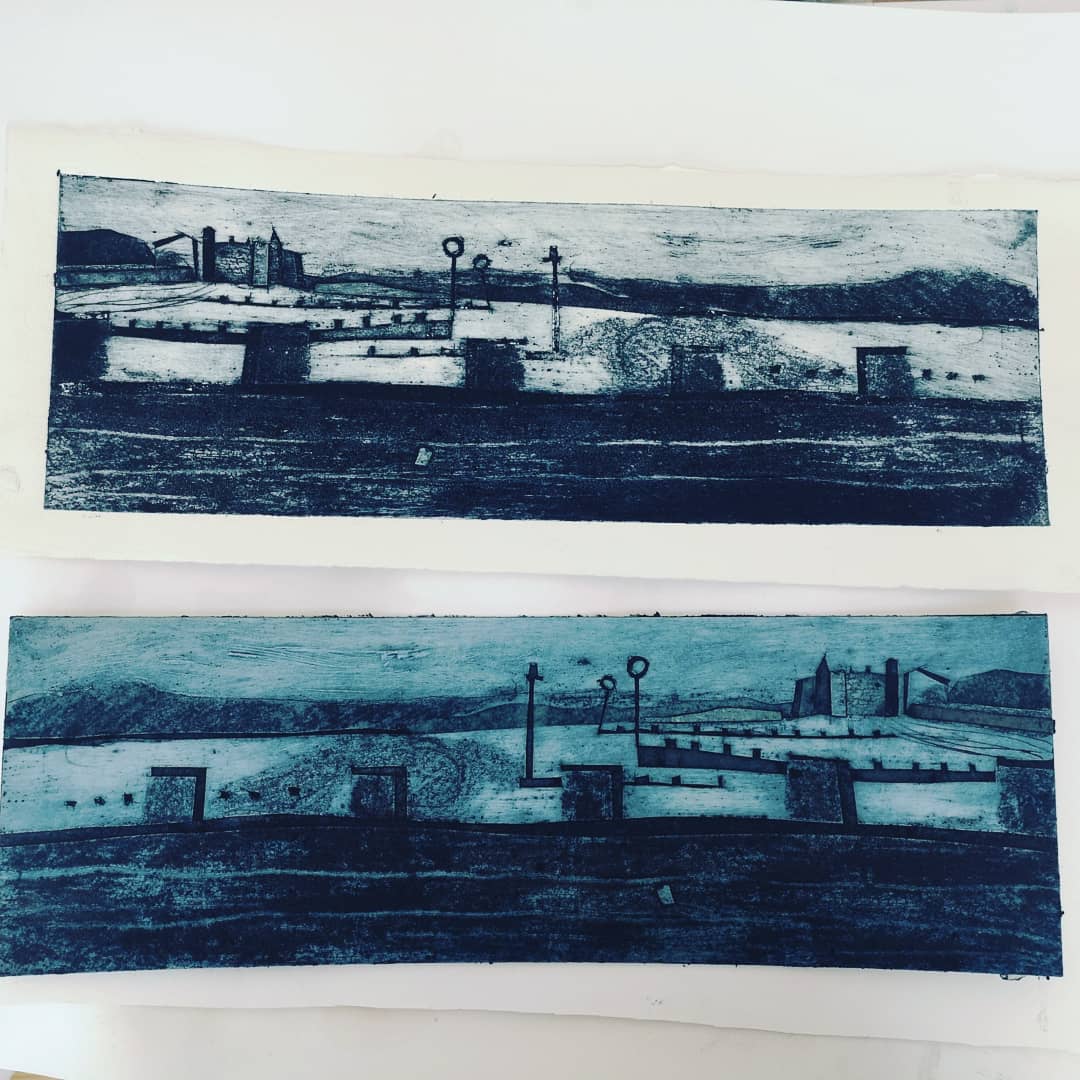 Collagraph involves making a textured ‘plate’ from cardboard and found materials. It is usually printed as an Intaglio print, where the ink is applied and then rubbed back so that it sits in the hollows on the plate. It is then printed using great pressure and damp paper, forcing the paper into the hollows where it picks up the ink. It is quite a painterly and fluid form of printmaking, offering surprising and often very atmospheric results.