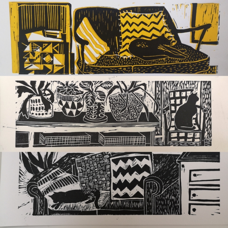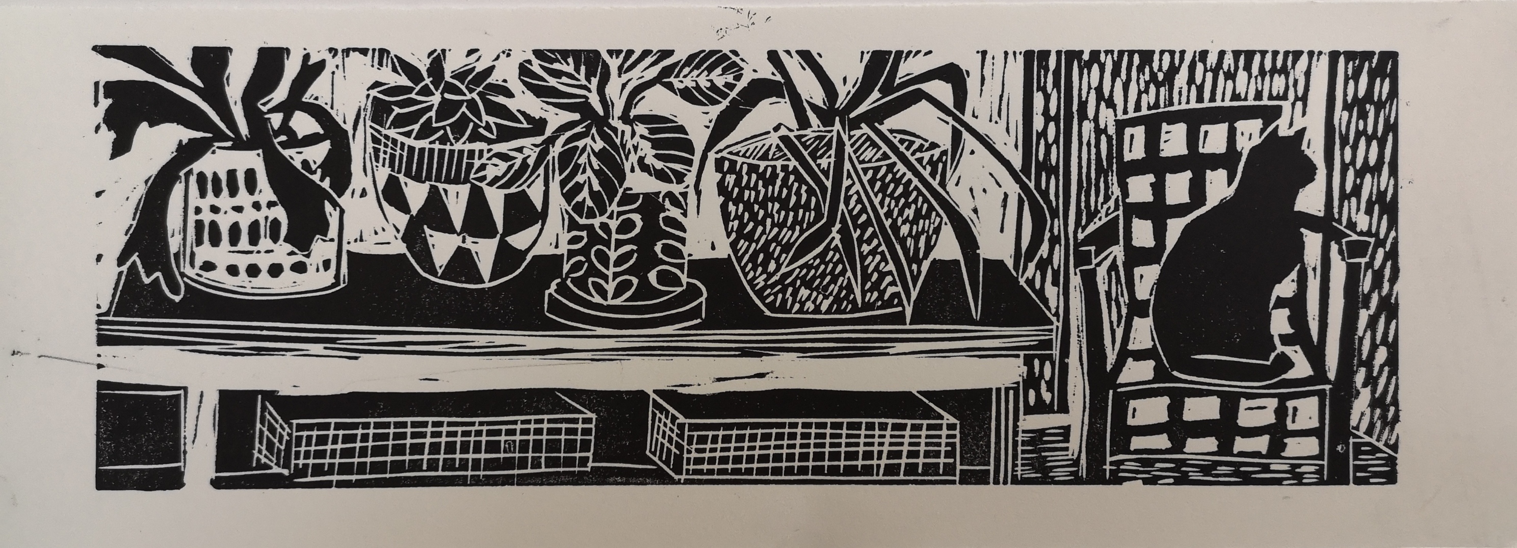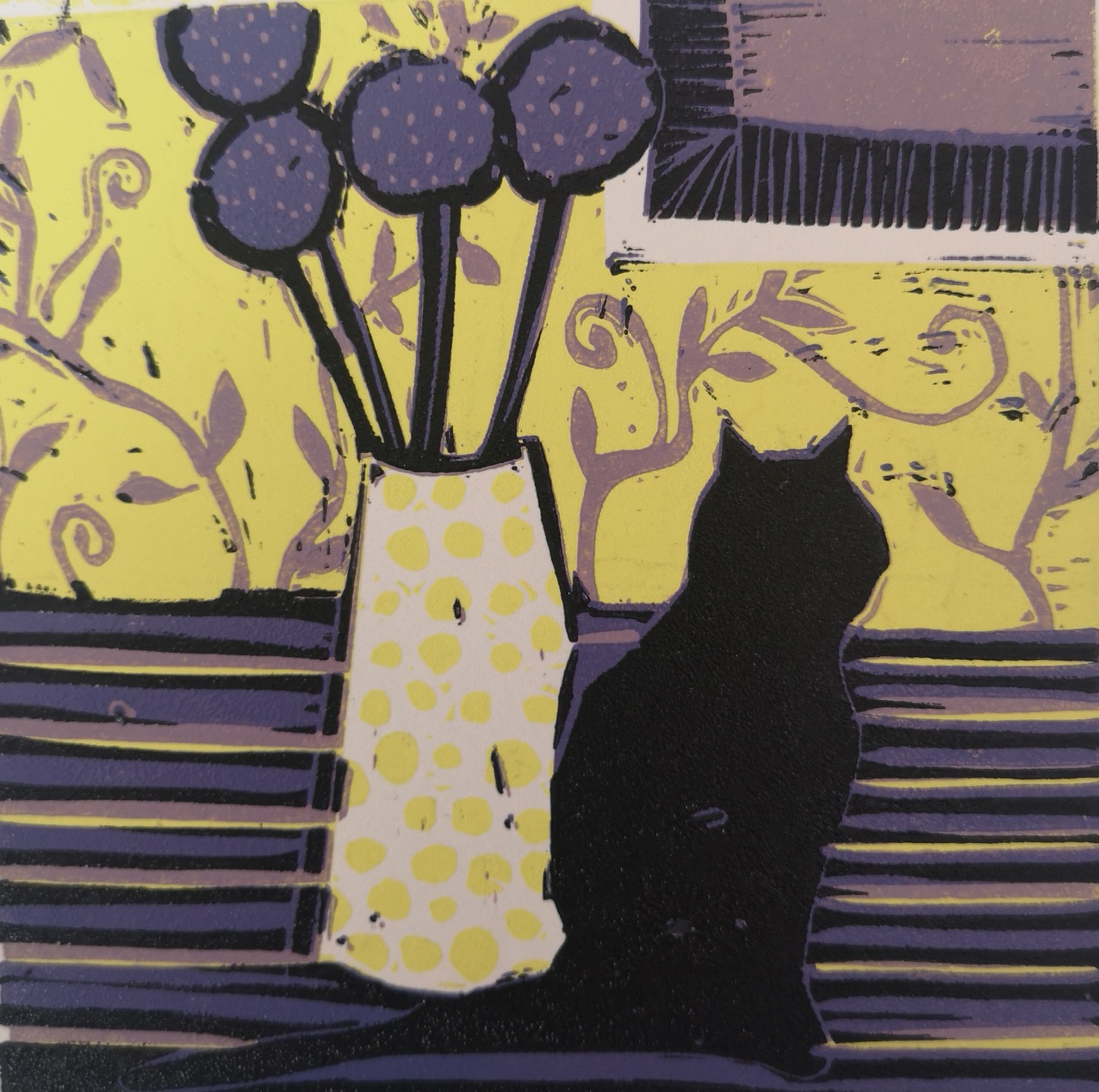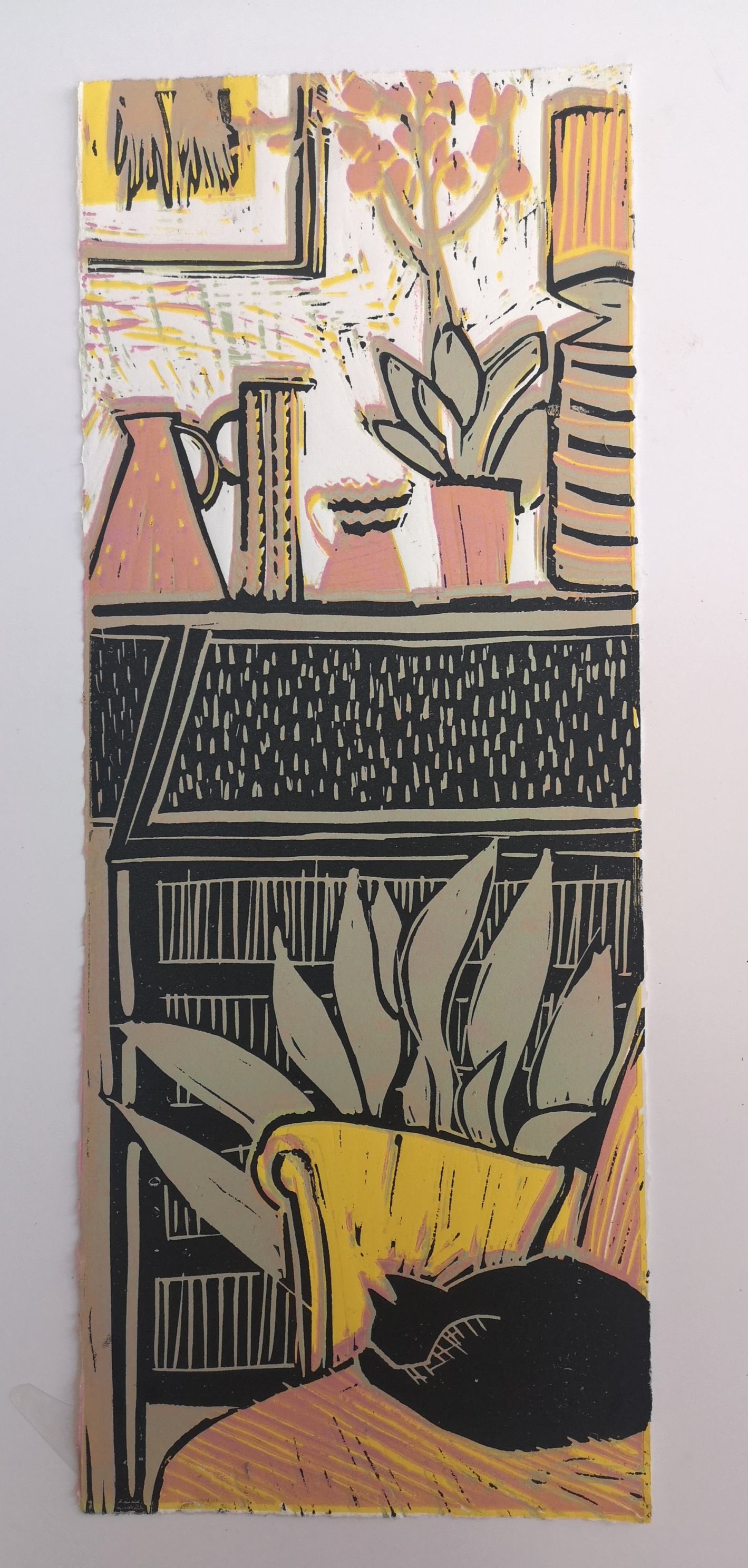 During the Covid-19 Pandemic, my usual access to printmaking facilities was curtailed and everything closed down. I decided to convert a small craft die-cutting machine, normally used for cutting out shapes in papercraft, into a small rolling press. I used this to print linocuts and collagraphs. I also made the decision to take my inspiration from my direct environment, as we were not allowed to travel outside, so my cat, Sunny, featured heavily!