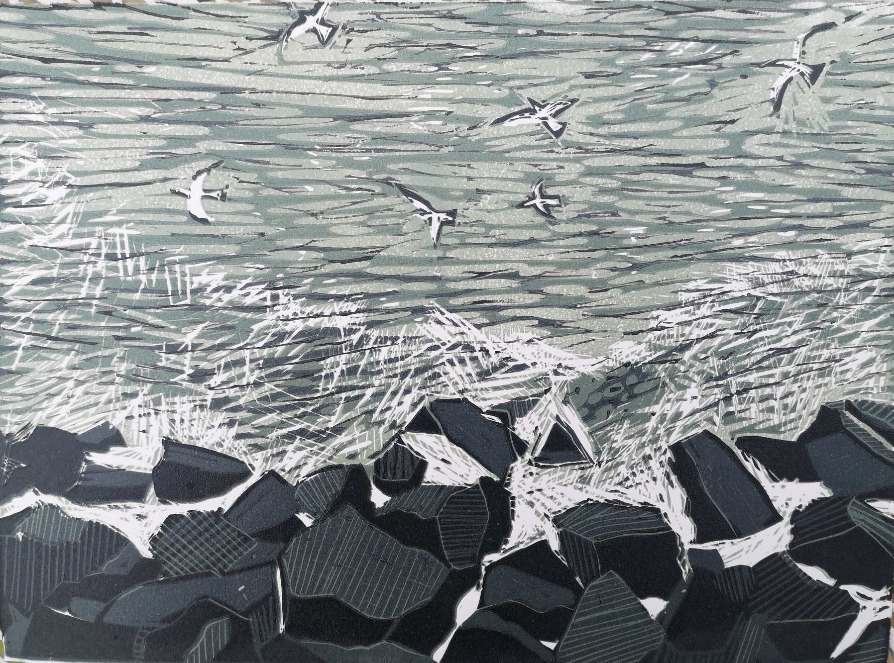 Linocut is a relief printing method, where areas of lino are carved out and ink applied to the remaining raised surface, which is then printed by applying pressure. You can make single colour or more complicated multi-colour prints, but it is very different to the complex photographic processes I use in my screenprinting.