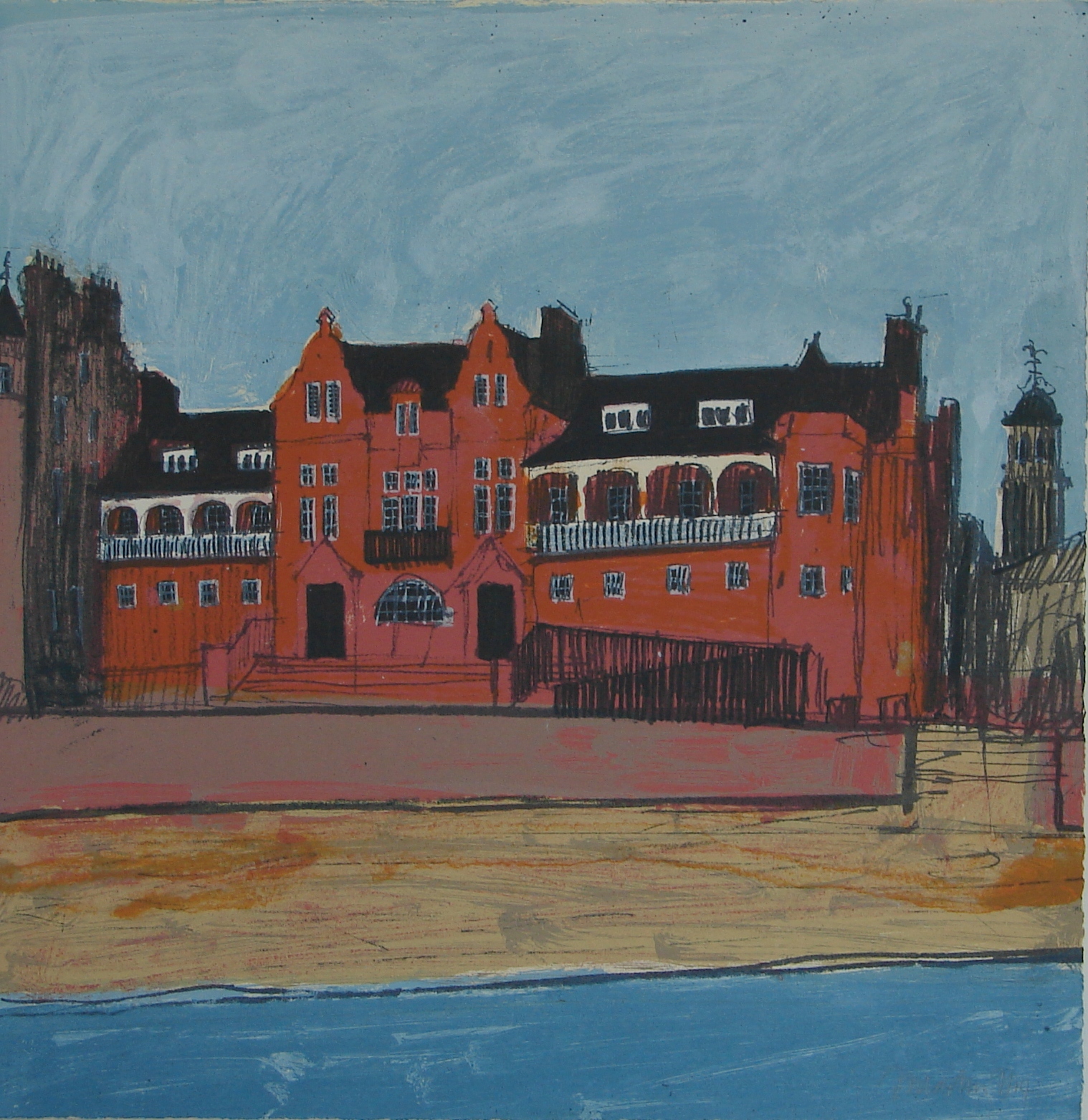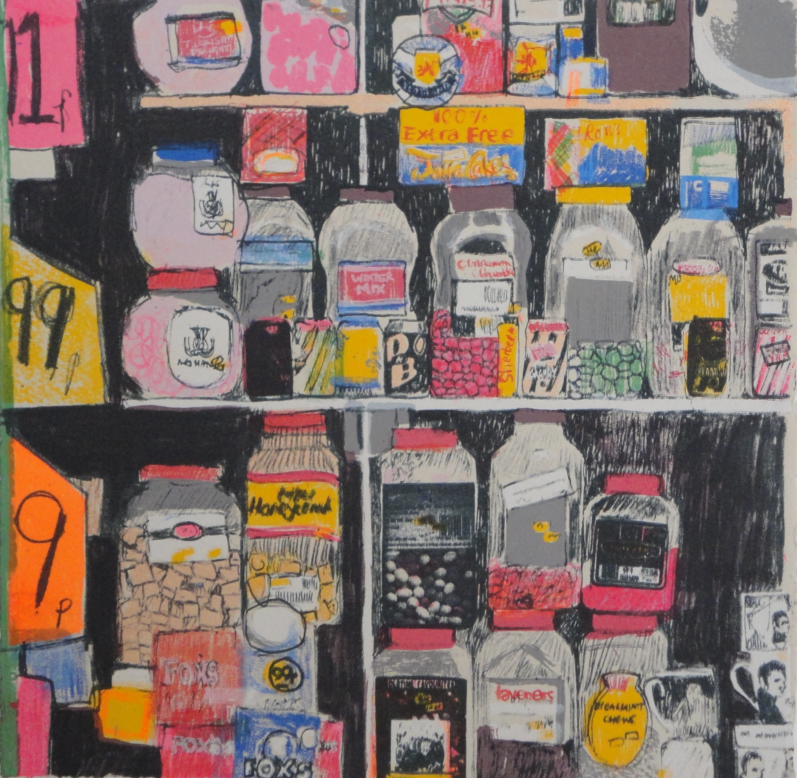 I live in a lovely part of Edinburgh called Portobello, which is Edinburgh’s seaside. I am lucky enough to live right on the Promenade beside the beach. Before I had children, I tended to find a lot of my inspiration from places far away and exotic, but then I found myself much more limited about where I could go – sometimes it was all I could do to get out to the Co-op! I decided to make a series of works about where I live, and realised there was a rich source of interesting subjects right on my doorstep. The seaside was changing, and I discovered I was drawing places and shops which were disappearing as demand for them fell; the work became almost a document of how these changes, and once again my perpetual themes of what we value as a human race, came to the fore.