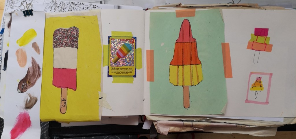 I use sketchbooks a lot, both to research ideas that I might use in my paintings or prints, or to visually develop my ideas further. I find sketchbooks are a ‘safe space’ where I can play with colour, try new subjects, experiment and make mistakes – all within the safety of a book! It doesn’t matter if things don’t work – I can just turn the page and try again.